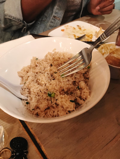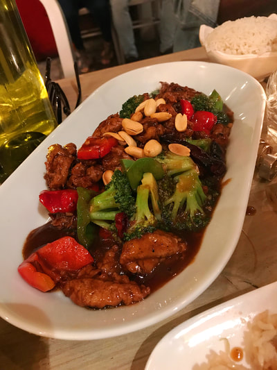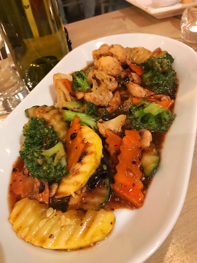 As we continued our much needed conversation over dinner, we were given some time for our starters to settle, and then they brought out the entrees. Black Bean Ginger Stir-Fry, Garlic Fried Rice & Spicy “Chicken” and Broccoli. Again, some amazing dishes, and very filling.